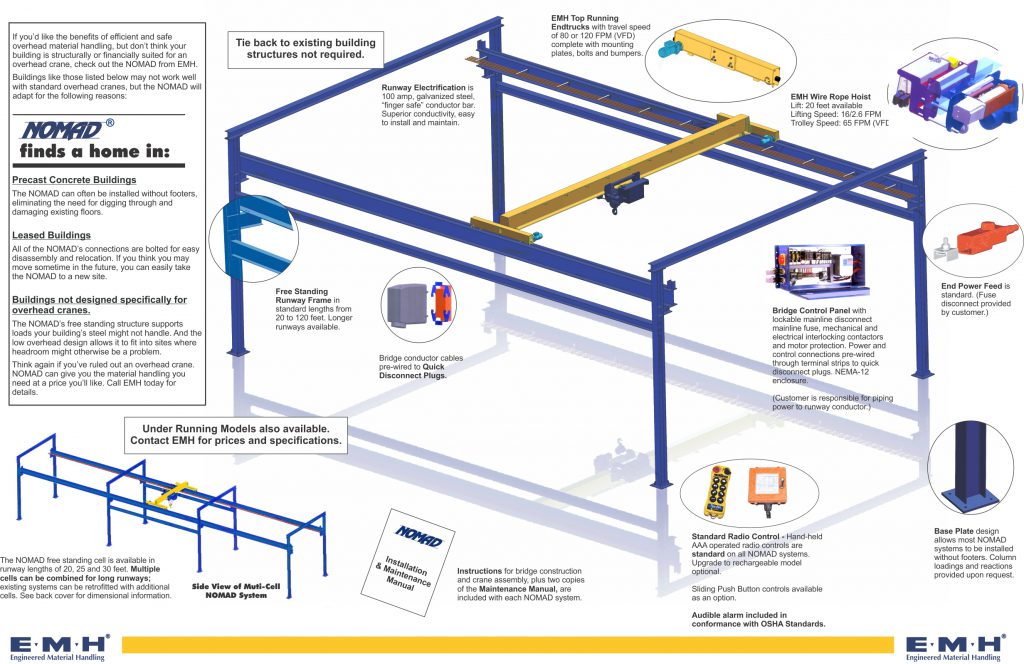 The NOMAD® Free Standing Crane System is a perfect solution for situations where overhead crane installation is otherwise difficult or impractical. Because the runways are usually installed above the floor without footers, NOMAD® Cranes work well in pre-cast concrete buildings. Since all connections are bolted rather than welded, the NOMAD® is easily dismantled and moved to another location, an advantage when used in a leased building. The NOMAD® free standing cranes low headroom design maximizes lift when headroom is at a premium.