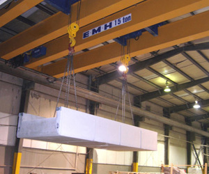 Two 15-ton, double girder, bridge cranes load prefabricated concrete components for shipment at a Kentucky precast manufacturing facility.